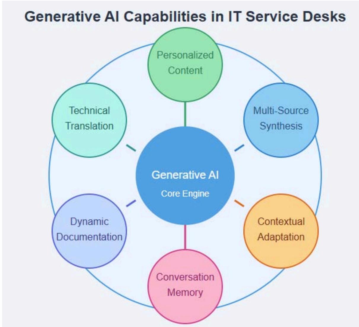 The technology excels in synthesizing information from multiple sources, combining policy documents, technical specifications, and historical resolution patterns to provide comprehensive answers. Soori's review documents the remarkable convergence of knowledge management and generative capabilities in modern support systems, with $82\%$ of surveyed implementations demonstrating the ability to autonomously integrate information from previously siloed repositories. Their analysis categorizes synthesis mechanisms into three tiers of sophistication: aggregative (combining information without contextual understanding), integrative (resolving conflicts and establishing relationships between sources), and generative (creating new knowledge from pattern recognition across multiple domains). The most advanced systems achieved generative-tier capabilities, enabling them to identify and address knowledge gaps that would otherwise require specialist intervention. The research presents multiple case studies, including a European pharmaceutical manufacturer where generative AI reduced compliance-related documentation errors by $87\%$ through intelligent synthesis of regulatory requirements, technical specifications, and historical audit findings. Most notably, $73\%$ of surveyed organizations reported significant improvements in knowledge retention during personnel transitions, with AI systems effectively preserving institutional knowledge that would otherwise be lost through staff turnover [5]. This capability extends to generating documentation automatically, creating user guides for new applications, and producing training materials that reflect current system configurations and procedures.