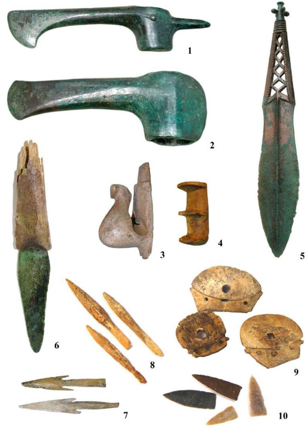 Fig. 5: Burial items: 1-2 - axes; 3-4 - parts of a complex bow; 5-6 - daggers; 7-8 - bones arrowheads; 9 - cheek-pieces; 10 - stone arrowheads (1-2, 5 - Stepnoye VII cemetery; 3-4, 6-10 - Stepnoye 1 cemetery)
