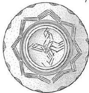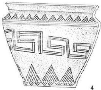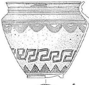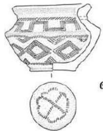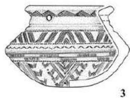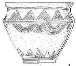 Besides ceramic vessels with remains of burial food, adult individuals had weapons (axes, daggers, arrowheads and remains of bows) (Fig. 5. 1-8, 10), tools (pestles, needles, awls, knives, spindles, chisels, etc.), elements of horse harness (Fig. 5.9), ornaments (Fig. 6), ritual objects (bone spatulas, sets of fortune-telling bones - astragali). The metal objects are made with great skill and indicate a high level of development of metallurgy among the Bronze Age communities. Decorations on ceramic vessels are based on the core Indo-European symbolic elements - swastika and meander (Fig. 7), which brightly manifested later in the great civilizations of antiquity.