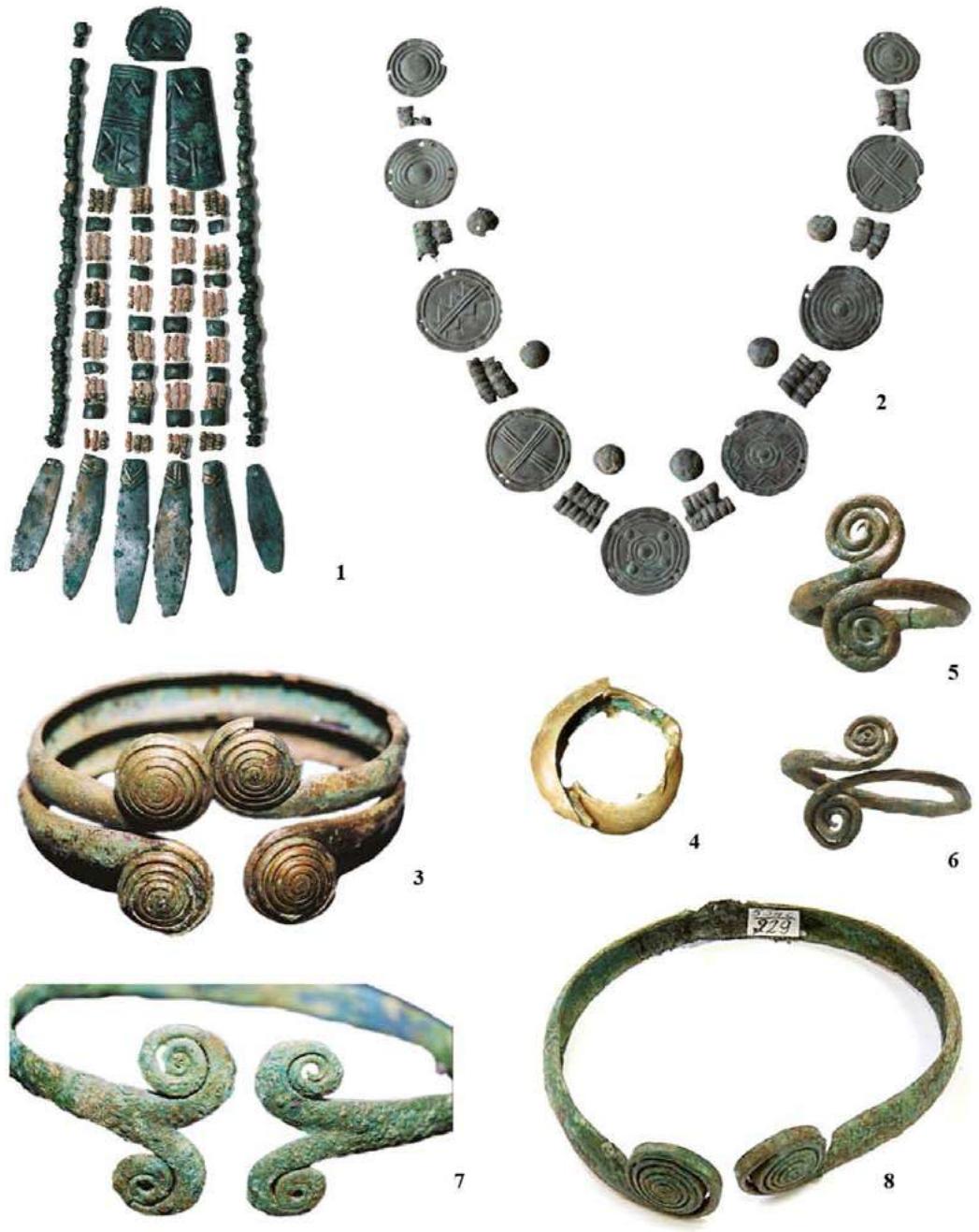 Fig. 6: Bronze Age woman ornaments, Stepnoye VII cemetery: 1 – braid ornament; 2 – face pendant; 3, 7-8 – bracelets; 4 – twisted golden pendant; 5-6 – rings