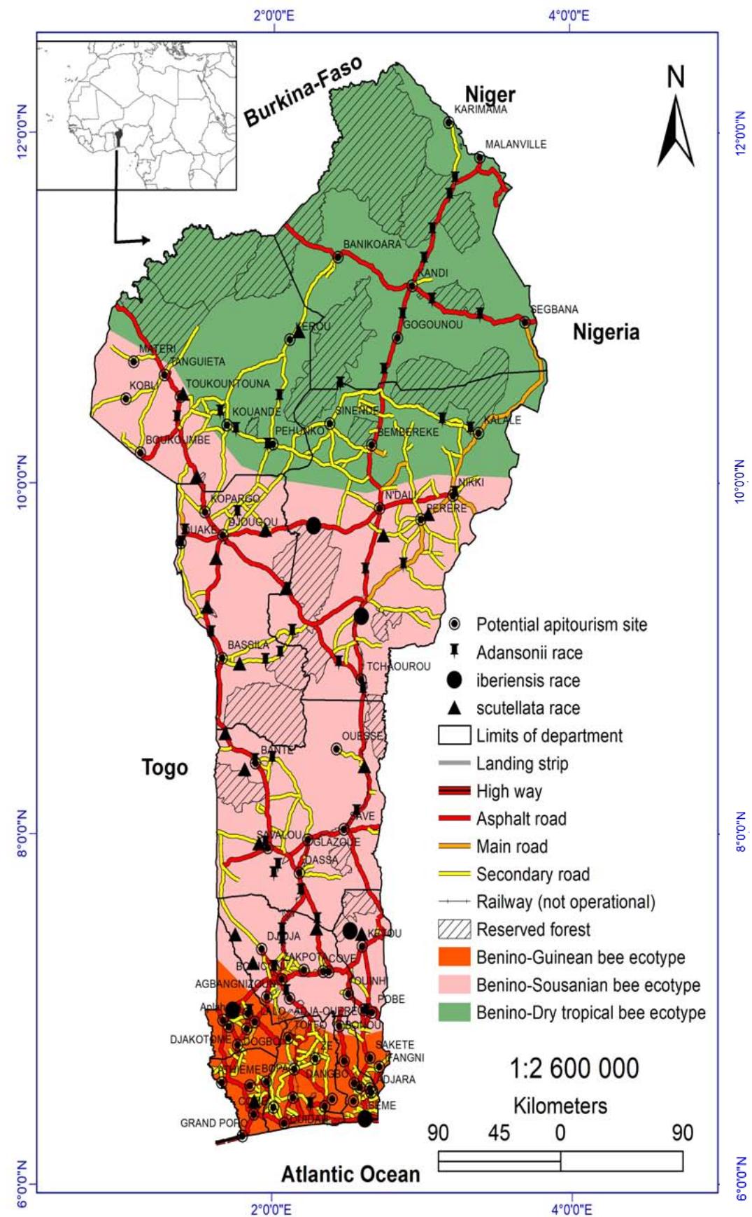 As far as the social bees are concerned, the honey bee Apis mellifera. Linnaeus 1758 and the nonstinging bee Hypotrigona ruspolii. Cockerell 1934 are the two widespread native species (Amakpe et al., 2019). A. mellifera, the honey-producing species under the provisions of CODEX Alimentarius (1981) is known as the domestic bee. But most honey bee populations in Benin are still in the wild where they nest in trees, termite mounds and houses. Morphometric and molecular genetic analyses (Amakpe et al., 2018), showed that they belonged to three races which were adansonii, scutellata and iberiensis. These races are distributed in the dry Benino-Guinean ecotype, the Benino-Soudanian ecotype, and the Benino-dry tropical honeybee ecotype as the consequences of their adaption to the different ecological areas of the country.