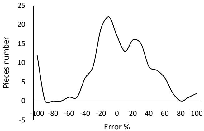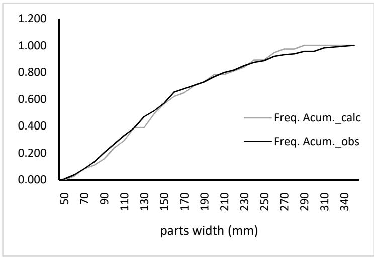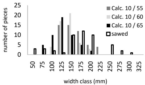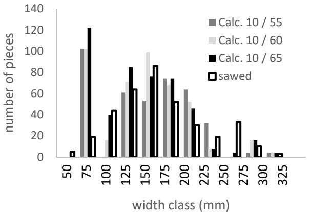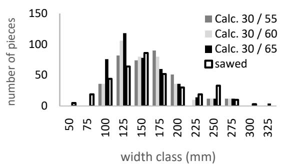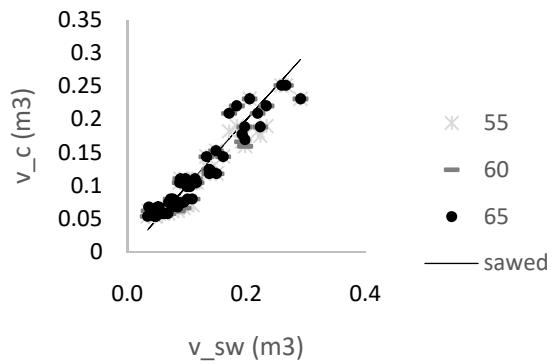 One information that is generally not used but is still essential to the economic evaluation and wood yield of the sawmill production chain is the quantification of lumber a priori. The few applications that provide a solution to this problem work with one log at a time and generally use optimization techniques instead of cut pattern models. The software developed for this work uses trigonometric rules, applying the circumscribed square (block), longitudinal (or tangential), log rotation, and radial cut patterns to help a producer sell a tree not in cubic meters but as a function of the pieces obtained from trees. Six tests were performed using trees and individual logs. The comparison between the calculated and milled or drawing pieces was presented for each model. The total errors obtained were approximately 2% for priority pieces. The best accuracy for the number and volume of the lumber pieces was 2.2% and -5.4%, respectively, obtained with a 30 o angle of the slab (waste wood) and 0.60 to the proportion of the radius parameters in the model that rotates the log. The total calculated and observed piece width distributions were statistically equal in the radial model. This application requires observation of the milling operation while monitoring parameters in a heterogeneous sample of wooden logs to obtain the best results.