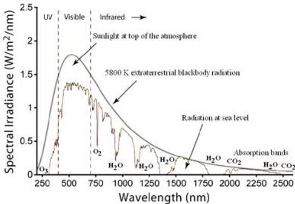 Fig. 3: Solar radiation spectrum with absorption bands by different atmospheric gases