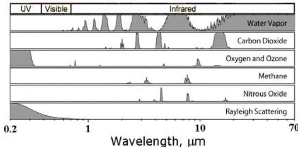 Fig. 4: Solar and IR radiation spectrums with absorption bands by different atmospheric gases (Wikipedia)