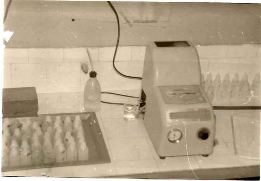 Before we start the testing of solutions, is necessary to correct the scale of flame device. For this we immerse the electrode in a jar with standard solution $\mathrm{Na}+$. In the scale of calibration for the flame device, distilled water is equal $=0$. The standard $st = 11$ correspondents $=100$ of the scale. The in between checking steps are standard $= 6$ which corresponds to flame device scale $= 66$ and the standard $= 3$ which corresponds to flame device scale $= 28$. This is the procedure to check the sensitivity of flame corn flame testing device. (Photography 1).