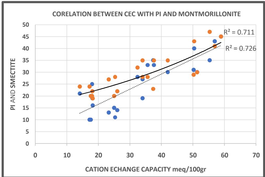 - exchange capacity of a soil and variances of the liquid and plasticity limit values as well as for montmorillonite percent. The relation between cation exchange capacity percent and montmorillonite% with plasticity index is linear with a moderate coefficient of regression $R^2 = 0.7267$. The relation between cation exchange capacity percent and and liquid limit values is exponential with a strong coefficient of regression $R^2 = 0.8178$, as the clay content increased.