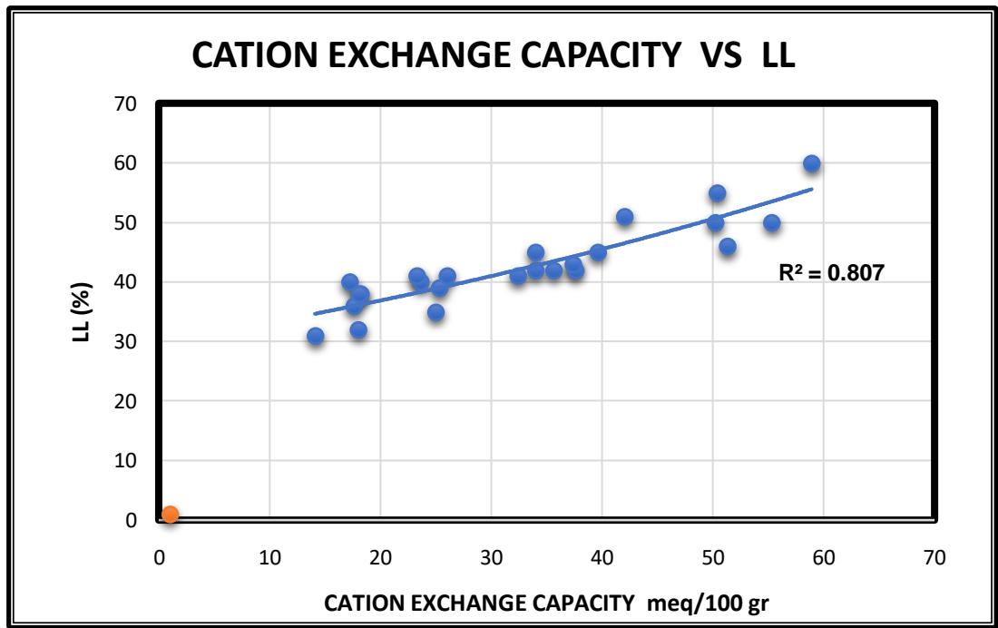 - In diagram 2 between liquid limit (LL) and cation exchange capacity (CEC) there is one exponential relation of the type $\mathsf{Y} = \mathsf{ab}^{\mathsf{x}}$ with a strong coefficient of regression $R^2 = 0.8178$.