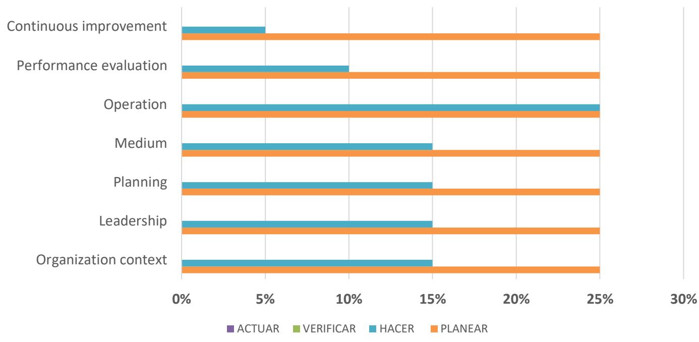 Carrying out the analysis, it is observed that although procedures and formats have been established that respond to the ISO 9001:2015, ISO 14001:2015 and ISO 45001:2018 standards, the application of these is not frequent in the different institutional processes, therefore The improvement cycle and decision making based on real information are interrupted, this explains why a high degree of compliance is observed in the planning phase, a percentage that is significantly affected when the implementation, verification and taking of actions are investigated. against the detected deviations.