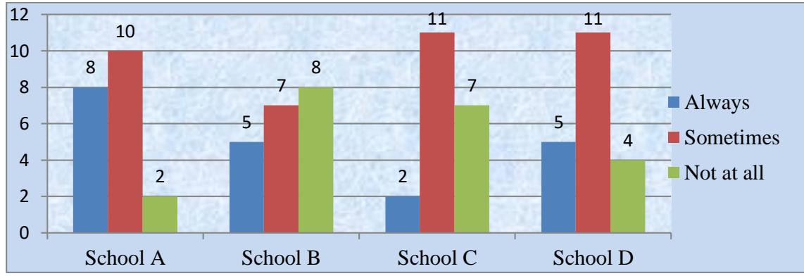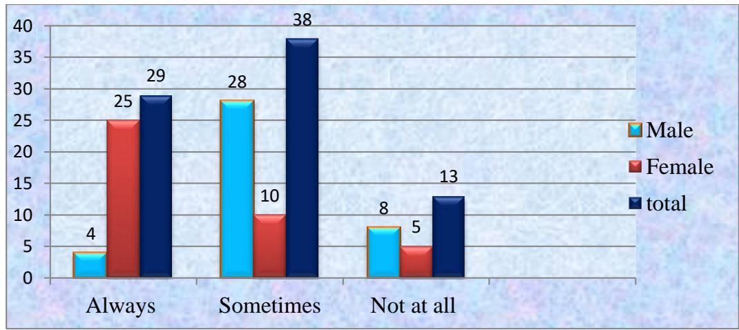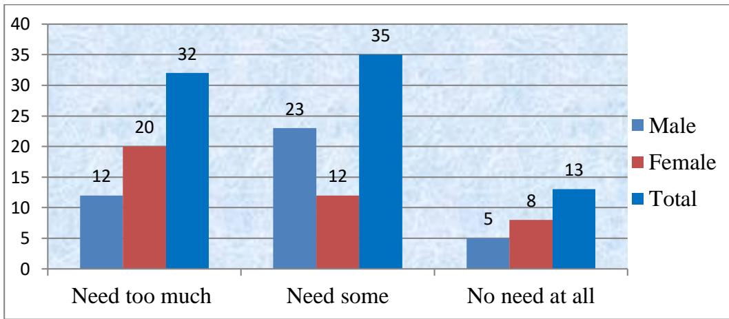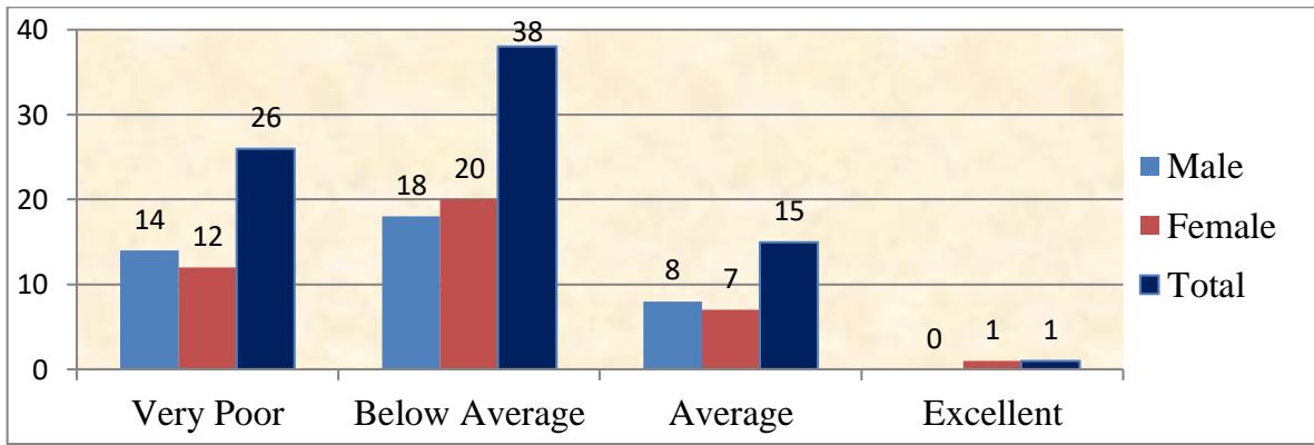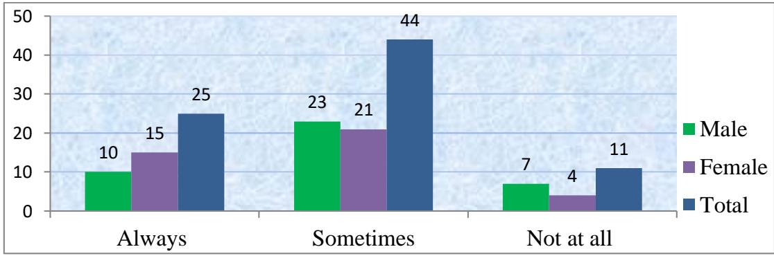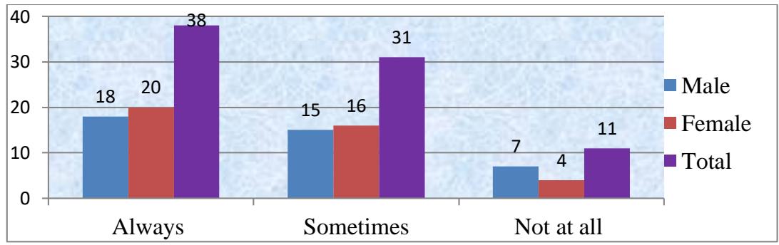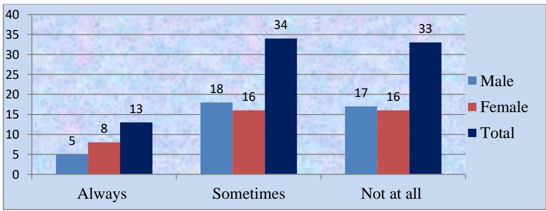 The survey included 80 students, 40 boys and 40 girls, from grades 6 to 10, from four separate schools, each contributing 20 students. The questionnaire's questions were written in the form of statements. The author chose a scaled framework. The researchers avoided asking leading, high-brow, complex, culturally biased, annoying, and double-negative questions. Moreover, the researcher led them through the questionnaire, explaining where necessary persuading them not to consult during the questionnaire. As before, the researcher described his position as non-judgmental and non-evaluative, assuring participants anonymity and confidentiality.