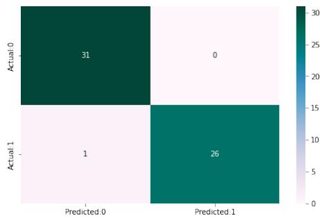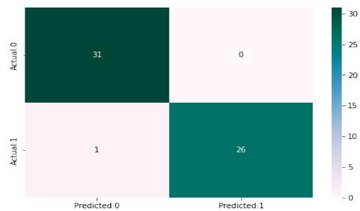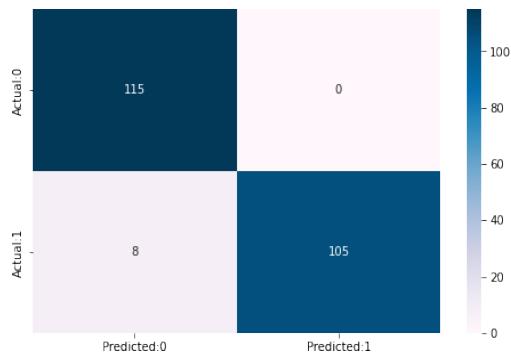<table><tr><td></td><td>precision</td><td>recall</td><td>f1-score</td></tr><tr><td>0</td><td>0.97</td><td>0.99</td><td>0.98</td></tr><tr><td>1</td><td>0.99</td><td>0.96</td><td>0.98</td></tr></table>