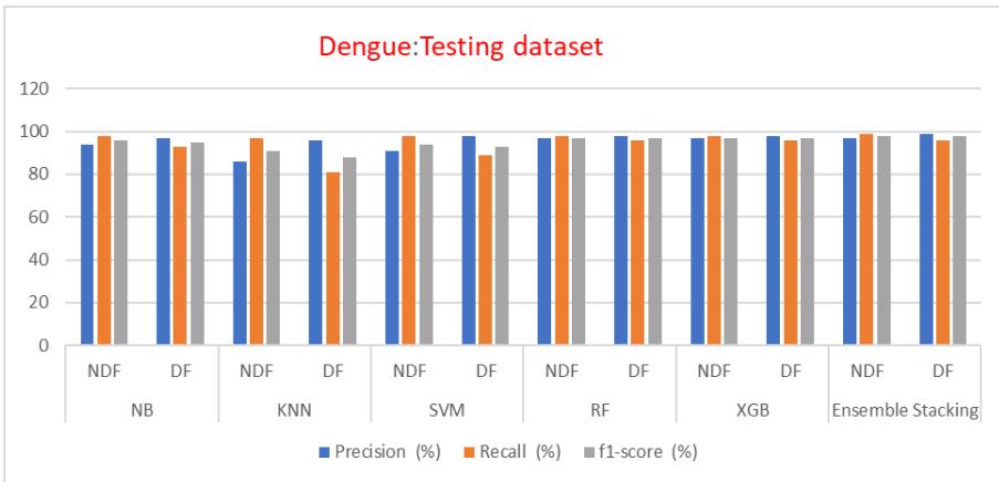 <table><tr><td colspan="5">Testing Dataset</td></tr><tr><td>Classifiers</td><td></td><td rowspan="2">Precision (%)</td><td rowspan="2">Recall (%)</td><td rowspan="2">f1-score (%)</td></tr><tr><td></td><td></td></tr><tr><td>NB</td><td>NDF</td><td>94</td><td>98</td><td>96</td></tr><tr><td></td><td>DF</td><td>97</td><td>93</td><td>95</td></tr><tr><td>KNN</td><td>NDF</td><td>86</td><td>97</td><td>91</td></tr><tr><td></td><td>DF</td><td>96</td><td>81</td><td>88</td></tr><tr><td>SVM</td><td>NDF</td><td>91</td><td>98</td><td>94</td></tr><tr><td></td><td>DF</td><td>98</td><td>89</td><td>93</td></tr><tr><td>RF</td><td>NDF</td><td>97</td><td>98</td><td>97</td></tr><tr><td></td><td>DF</td><td>98</td><td>96</td><td>97</td></tr><tr><td>XGB</td><td>NDF</td><td>97</td><td>98</td><td>97</td></tr><tr><td></td><td>DF</td><td>98</td><td>96</td><td>97</td></tr><tr><td>Ensemble</td><td>NDF</td><td>97</td><td>99</td><td>98</td></tr></table>