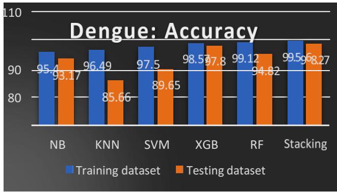 <table><tr><td>Classifiers</td><td>Training Dataset</td><td>Testing Dataset</td></tr><tr><td>NB</td><td>95.40</td><td>93.17</td></tr><tr><td>KNN</td><td>96.49</td><td>85.66</td></tr><tr><td>SVM</td><td>97.51</td><td>89.65</td></tr><tr><td>XGB</td><td>98.57</td><td>97.80</td></tr><tr><td>RF</td><td>99.12</td><td>94.82</td></tr><tr><td>Stacking</td><td>99.56</td><td>98.27</td></tr></table>