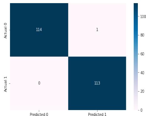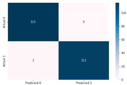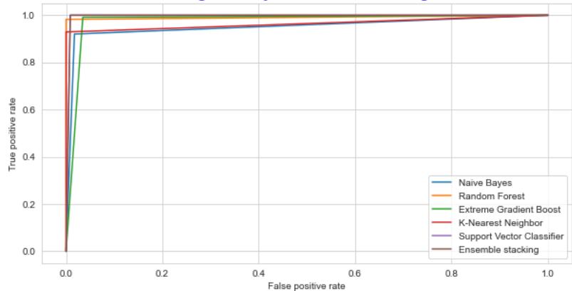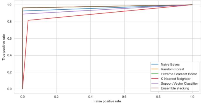 The ability of the classifier can be measured by Area Under the (AUC) Curve. It is the summary of the ROC curve. High AUC indicates that the performance of the model is better, wherein differentiating between the positive and negative groups. AUC comparison with other classifiers is listed in TABLE IV. The AUC for the proposed ensemble XGB is $97.14\%$ and $97.81\%$ for random forest $98.14\%$ and $99.14\%$, for stacking $98.14\%$ and $98.68\%$ for testing and Training datasets respectively. As shown in Table III, the AUC values for the datasets lie between 0.97 to 0.99, indicating that the positive class values are correctly distinguished from the negative class values.