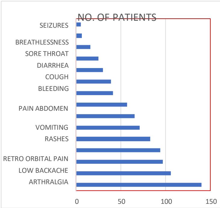 <table><tr><td>Clinical Feature</td><td>No. of Patients</td></tr><tr><td>Fever</td><td>140</td></tr><tr><td>Headache</td><td>106</td></tr><tr><td>Myalgia</td><td>97</td></tr><tr><td>Arthralgia</td><td>94</td></tr><tr><td>Low Backache</td><td>83</td></tr><tr><td>Retro Orb Pain</td><td>71</td></tr><tr><td>Rashes</td><td>65</td></tr><tr><td>Vomiting</td><td>57</td></tr><tr><td>Pain Abdomen</td><td>41</td></tr><tr><td>Bleeding</td><td>39</td></tr><tr><td>Cough</td><td>30</td></tr><tr><td>Diarrhea</td><td>25</td></tr><tr><td>Sore Throat</td><td>16</td></tr><tr><td>Breathlessness</td><td>6</td></tr><tr><td>Seizures</td><td>5</td></tr></table>