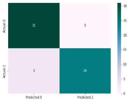 <table><tr><td></td><td>precision</td><td>recall</td><td>f1-score</td></tr><tr><td>0</td><td>0.93</td><td>1.00</td><td>0.97</td></tr><tr><td>1</td><td>1.00</td><td>0.93</td><td>0.96</td></tr></table>