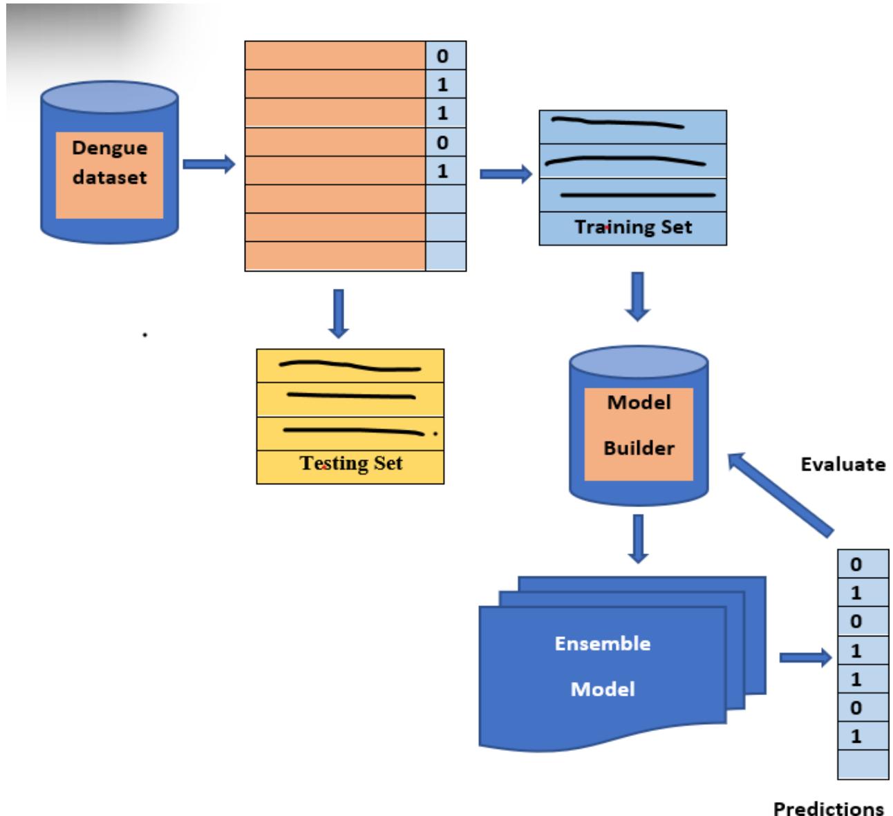 Each base classifier is used in the ensemble framework by training data to make it useful for the prediction of dengue. Dataset features and target values are known to each classifier, which in turn can predict whether the disease is present or not.