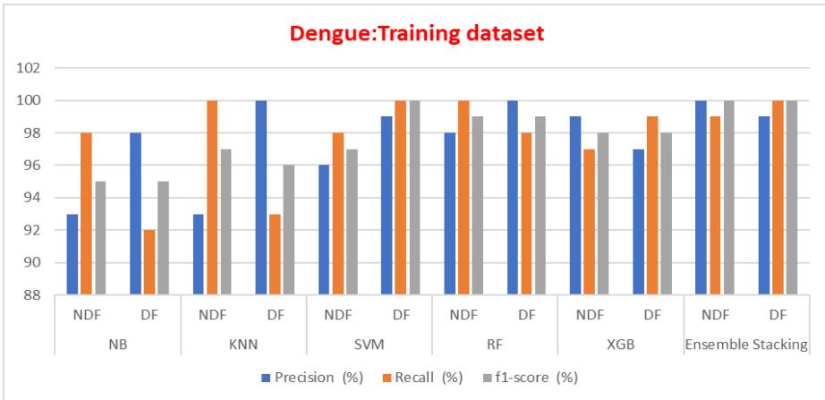 <table><tr><td colspan="5">Training dataset</td></tr><tr><td>Classifiers</td><td></td><td>Precision (%)</td><td>Recall (%)</td><td>f1-score (%)</td></tr><tr><td rowspan="2">NB</td><td>NDF</td><td>93</td><td>98</td><td>95</td></tr><tr><td>DF</td><td>98</td><td>92</td><td>95</td></tr><tr><td rowspan="2">KNN</td><td>NDF</td><td>93</td><td>100</td><td>97</td></tr><tr><td>DF</td><td>100</td><td>93</td><td>96</td></tr><tr><td rowspan="2">SVM</td><td>NDF</td><td>96</td><td>98</td><td>97</td></tr><tr><td>DF</td><td>99</td><td>100</td><td>100</td></tr><tr><td rowspan="2">RF</td><td>NDF</td><td>98</td><td>100</td><td>99</td></tr><tr><td>DF</td><td>100</td><td>98</td><td>99</td></tr><tr><td rowspan="2">XGB</td><td>NDF</td><td>99</td><td>97</td><td>98</td></tr><tr><td>DF</td><td>97</td><td>99</td><td>98</td></tr><tr><td rowspan="2">Ensemble Stacking</td><td>NDF</td><td>100</td><td>99</td><td>100</td></tr><tr><td>DF</td><td>99</td><td>100</td><td>100</td></tr></table>