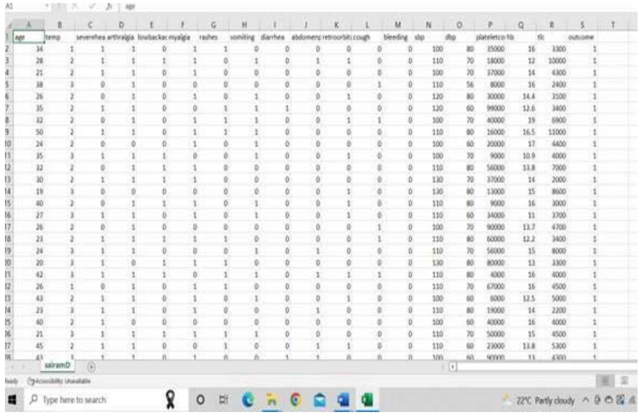 It consists of 286 instances with 18 attributes and one target. The target consists of dengue patients and Non dengue patients. levels. The numerical value is assigned for each level like 0 for non- dengue patients (NDF), and 1 for Dengue patients (DF). The screenshot of the dataset is shown in Fig.5.