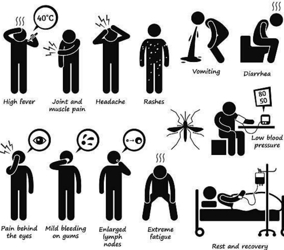According to the World Health Organization, Dengue fever is classified into four types: DENV1, DENV2, DENV3, and DENV4. The incubation period is 2 to 7 days [4]. The Dengue symptoms are high fever, joint and muscle pain, headache, vomiting, rashes, pain behind the eyes, diarrhea, etc. The dengue fever symptoms are shown in Fig.2.