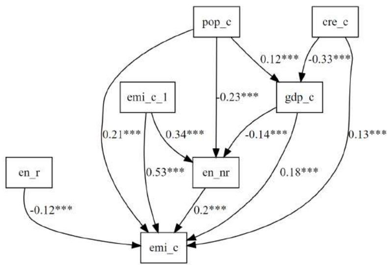 Similarly, Private Sector Domestic Credit has an indirect and negative impact on CO2 emissions through the pathway cre_c => gdp_c => emi_c. The indirect pathway through GDP per capita also indicates that a 1% increase in Private Sector Domestic Credit will decrease carbon dioxide emissions by 0.33%. Consistent with results found by D'Orazio and Dirks (2022) and Aveno and Tregenna (2022).