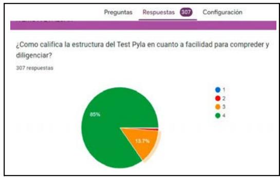 En laagna: ¿Có como califica la estructura del Test Pyla en cuando a fácilidad para comprendir y diligenciar? (Figura 5), el $85\%$ de los estudiantes calificaron la herramienta con una puntoación de 4 (la máxima puntoación), describirendo el test como una herramienta fácil de comprendir y diligencer.
