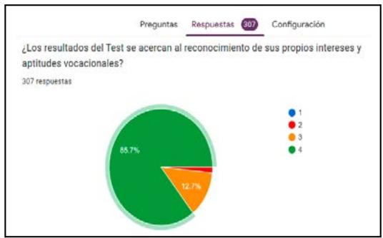 En la figura 5, la pregunta busca indagar sobre la asertividad de los resultados del test. El $85.7\%$ de los estudiantes se identificó con los resultados del test, calificandolo con un promedio de 3,84.