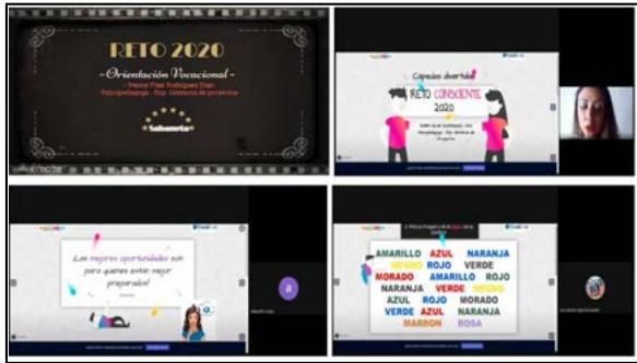 COVID 19. Para mitigar las consecuencias de la pandemia al sector educativo en el Municipio de Sabaneta, se incluyó el acontecimiento Psicopedagogico a la modalidad virtual en losodos 10 y 11, bajo el caso del caso desarrollo un taller vocacional conactividades de sensibilización,activación neuronal atramés de ejercicios, videos y frases, identificacion de intereses ydesarrollo guiado del Test Vocacional PYLA.