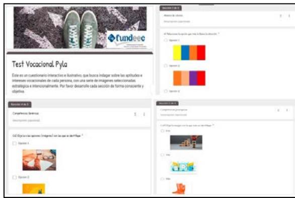 A continuación se describe laestructura general del Test Vocacional Pyla, se creó un formulario de google que contiene 5 secciones: