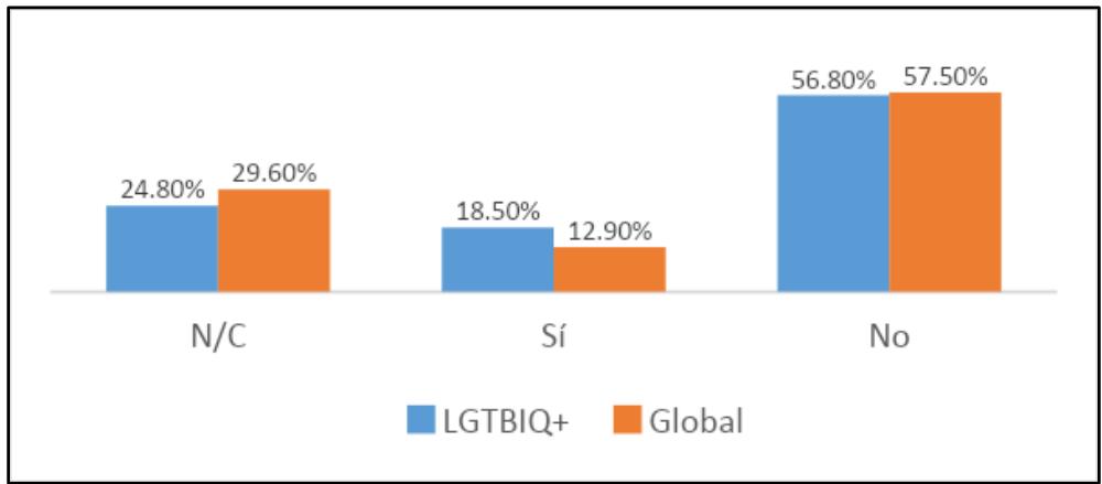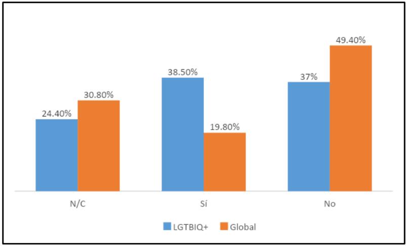 However, nearly the same number of members of the LGBTQI+ community as the rest of the university are unaware of the existence of CUM services that specialize in attention for the LGBTQI+ community, as seen in Graph 1. Focusing attention on the affected people who responded $(n = 400)$, it is significant that only 83 knew of the Unit for Sexual Diversity and Gender Identity at the Office of Diversity and Inclusion, which provides support for the facilitation of gender and name changes in bureaucratic procedures and mediation in cases of homophobic violence, among other functions.