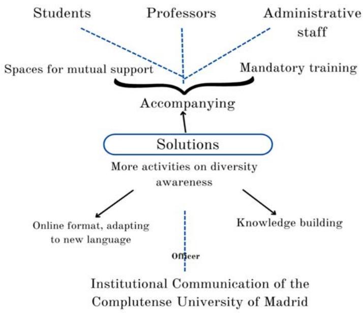 Once the main challenges were identified, the interviewees were asked to develop a proposal for improvement that could be applied at CUM. As seen in Figure 4, the new communicative proposal of the university is as much based on the execution and diffusion of obligatory formative actions for teaching staff and personnel of the institution as on designing a guide of good practices that can be applied in the classroom. In addition, the community mentioned the importance of developing a specific protocol against homophobic violence and implementing actions to raise consciousness and awareness of the institution's commitment. For everyone, the communicative strategy must be synonymous with support, encouraging the general perception of the campus as being a place of mutual support between the LGBTQI+ community and the rest of the community at CUM.