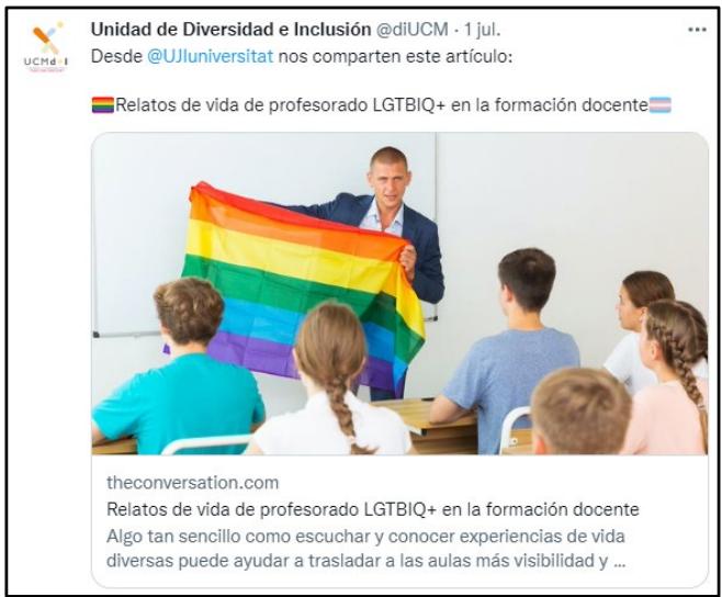 Twitter is used as a channel to share informative content about the LGBTQI+ community and in one article called "The Conversation", the experience of the LGBTQI+ teaching staff is shared. In addition, the Jaume I University is tagged, which is where the publication was originally shared. In this way, CUM is conveying the idea of institutional collaboration around the social issue in question through a message based on life experiences.