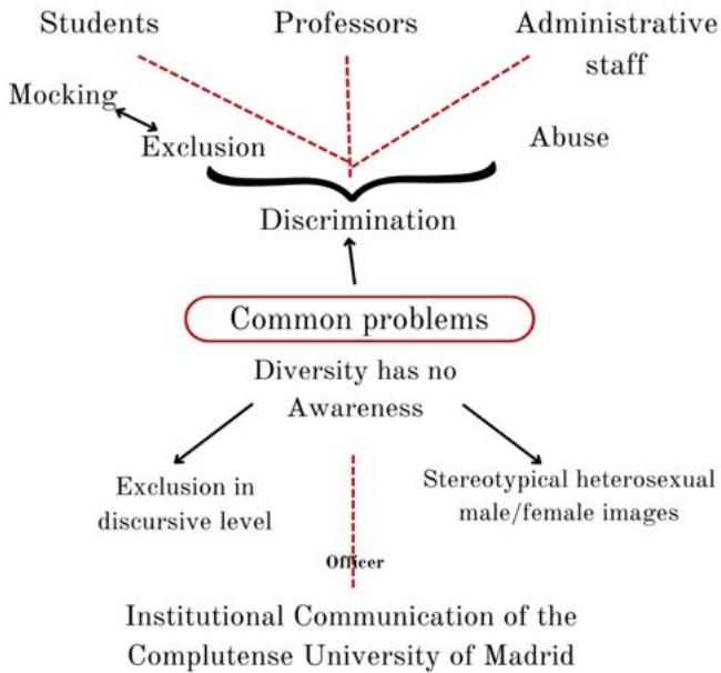 Both the students and the coordinators agree that the main challenge that the community faces is discrimination, as shown in Figure 3. Not enough resources are dedicated to making diversity visible. This is shown in both the discursive exclusion of the LGBTQI+ community as well as the images used in communications made by the institution. In the images, the stereotypical presence of men and women who fit a heteronormative pattern is prominent.