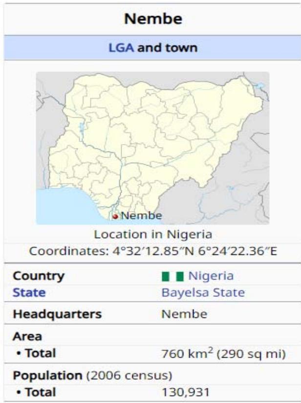 Nembe is the headquarters of the Nembe Local Government of Bayelsa State in Nigeria. Its geographical coordinates are $4^{\circ}32'23''$ North, $6^{\circ}24'$ East (The Bayelsa State Oil & Environmental Commission, 2022). It is a low-lying coastal area in the mangrove swamp rural area of the Niger Delta. The Nembe kingdom hosts international oil and gas companies like SPDC and ENI Nigeria. The presence of these companies has given rights to a lot of oil exploration and exploitation activities (NLGA, 2021). They also lamented years of oil spillages that have destroyed their environment, aquatic life, as well as air and water pollution and called on the Bayelsa State Oil and Environmental Commission (BSOEC) and international communities to come to their rescue (The Guardian Nigeria News, 2019). The location of the Nembe city in the Nigerian map is shown in fig. 2.
