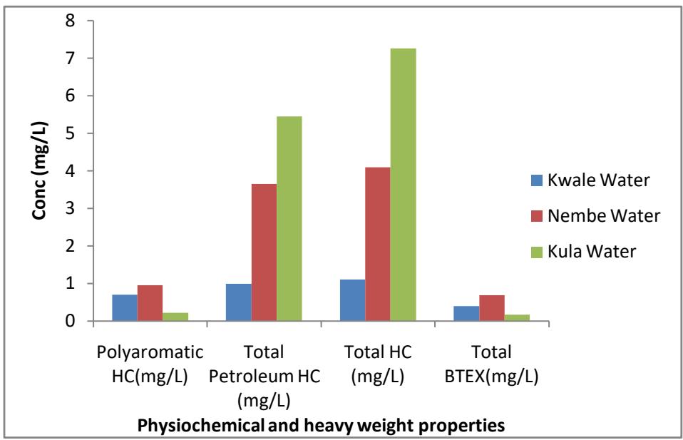 0.705mg/l (with traces of acenaphthylene, phenanthrene, anthracene and fluoranthene) and Kula water sample with 0.229mg/l (with traces of pyrene). Interestingly the results also showed that n-pentacosane concentration is the highest component of the Total Petroleum Hydrocarbon (TPH) family in the Kula and Kwale water samples while n-hexacosane concentration is the highest component of the TPH in the Nembe water sample. This explains why the Nembe water sample is cloudier than the Kwale and Kula water samples. Finally, in BTEX composition, the total BTEX is highest in Nembe water, followed by Kwale and the least of these components is in Kula water.