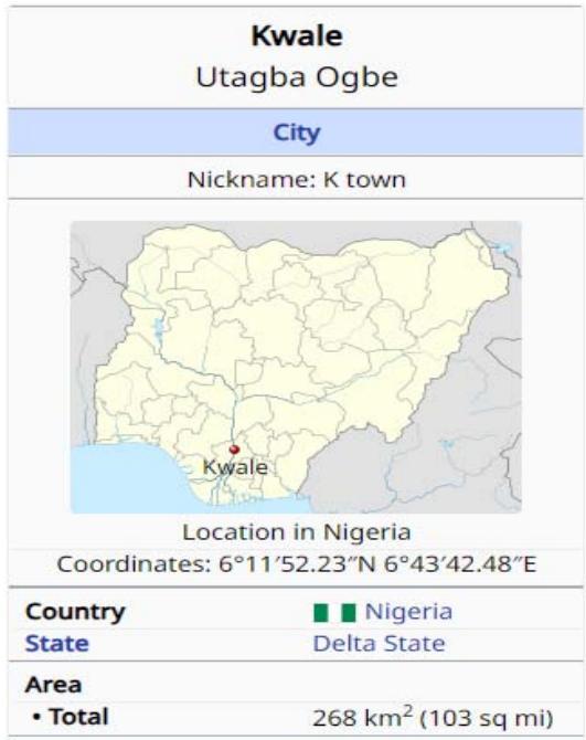 Kwale is the most populous community of the Uwkuani-speaking people of Delta State, Nigeria, and is located within the colonial Warri province (FRN, 2006). Kwale is generally considered a city especially considering its oil and gas reserves which can be utilized to transform the town and neighboring communities into a modern city (Mart Oil Resources Launches New Brand Identity, 2018). Kwale is host to oil and gas companies, some of which have a presence in different parts of the African city such as a gas flow facility which is situated at Ebedei nearby the Umukwuta area, and another at Ebendo and Umusadege with a pipeline running from Aboh and river Ase creek (TheNation, 2018). The location of the Kwale city in the Nigerian map is shown in fig 1.