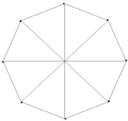 {"algorithm_caption":[],"algorithm_content":\[{"type":"text","content":"Python Program for Wagner Graph \\nimport turtle \\nimport math \\nt = turtle.Turtle() \\nt.speed("fastest") \\nfor k in range(8): t.penup() x1 = 300\\*math.cos(math.pi\\*((45\\\*k)%360)/180) y1 = 300\\*math.sin(math.pi\\*((45\\\*k)%360)/180) t.goto(x1,y1) t.pendown() x2 = 300\\*math.cos\\{(math.pi\\*((45\\\*k+45)%360)/180) y2 = 300\\*math.sin(math.pi\\*((45\\\*k+45)%360)/180) t.goto(x2,y2) radius = 300 \\nfor k in range(8): t.penup() t.goto(0,0) t.setheading(45\\\*k) t.forward(radius) t.pendown() t fillcolor("blue") t.begin_fill() tcircle(4) t.end_fill() radius = 300 \\nfor k in range(4): t.penup() x1 = radius\\*math.cos(math.pi\\*((45\\\*k)%360)/180) y1 = radius\\*math.sin(math.pi\\*((45\\\*k)%360)/180) t.goto(x1,y1) t.pendown() x2 = radius\\*math.cos\\{(math.pi\\*((45\\\*k+180)%360)/180) y2 = radius\\*math.sin\\} (math.pi\\*((45\\\*k+180)%360)/180) t.goto(x2,y2) t.hideturtle() Using the previous algorithm, we generate the Wagner graph as shown in Figure 1. "}\]}