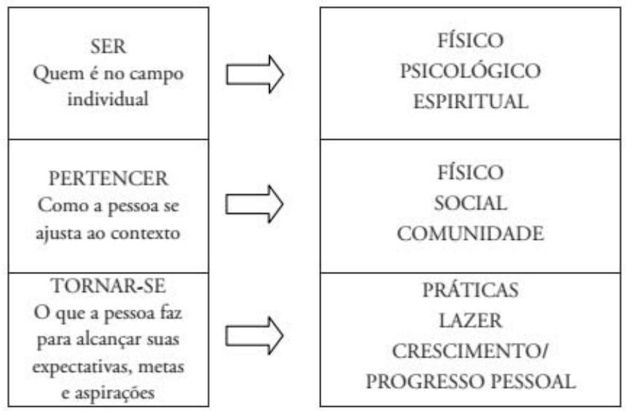 [.] o "ser" é entendido como o que o ser humano é, resultado de sua nutrição, aptidão física, habilidades individuais, inteligência, valores, experiências de vida, etc. Quanto ao "pertencer" trata-se das ligações que a pessoa tem em seu meio, casa, trabalho, comunidade, possibilidade de escolha pessoal de privacidade, assim como da participação de grupos, inclusão em programas recreativos, serviços sociais, etc. O "tornar-se" remete à prática de atividades como trabalho voluntário, programas educacionais, participação em atividades relaxantes, oportunidade de desenvolvimento das habilidades em estudos formais e não formais, dentre outros. Esses componentes apresentam uma organização dinâmica entre si, consideram tanto a pessoa, como o ambiente, assim como as oportunidades e os obstáculos." (Pereira, Teixeira e Santos, 2012, p. 243244)