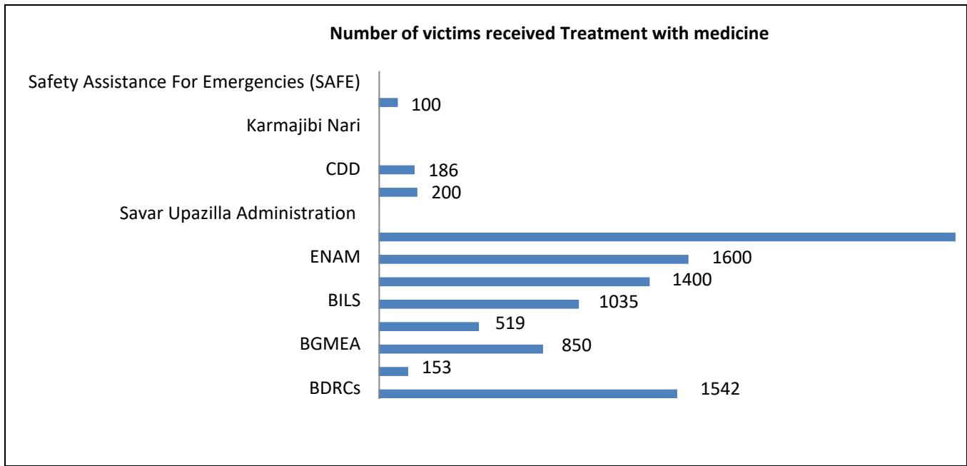Following the initial rescue efforts, the focus rapidly shifted to medical treatment. Figure 3 documents the various sources of medical support received. Public hospitals played a central role, yet victims reported unequal access to private healthcare. A striking example is the case of a pregnant survivor denied emergency cesarean delivery at a private hospital due to inability to pay BDT 30,000. She was later pronounced dead at Suhrawardy Hospital in Dhaka. Such incidents reveal the deep structural inequities in healthcare access that disaster victims often face.