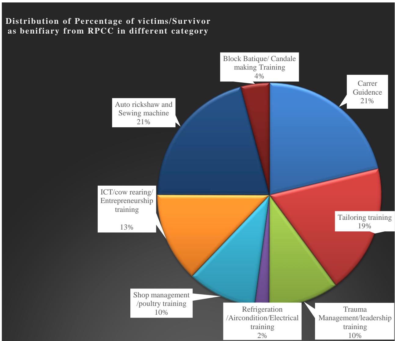 The paper found that There were a total of 2,438 (RPCC, 2014) survivors in the Rana Plaza incident who were indifferent physical conditions. It is found by the study conducted by ILO and GIZ that $8\%$ of the rescued victims had a permanent disability because of amputation and paralysis, $25\%$ had severe difficulty in walking. The database of the RPCC also represented this same scenario. So in this situation, it was a tough job to explore and integrate these types of special worker. On the other hand, $59\%$ of the survivor required support for initiating a small business (AAB, 2013). So in this Regard with the help of related stakeholder CRP, DAM, ILO, GIZ, Spandan-B, BRAC, GP, LFMEAB, Taranga RPCC developed interventions for small business support. It was based on market needs and existing pro-poor approaches used and sensitivity was shown to the process of psychological recovery according to the Action Plan of Rana plaza Study found that maximum victims were not willing to join in industry or had a trauma to join in the concrete infrastructure job environment. So to engage them in small business and also to overcome the trauma was a primacy of the job for all. The number of victims covered in this regard is shown in Figure 4. It is seen that career counselling and trauma management was in the significant percentage provided by RPCC in an association of its stakeholder (Figure: 4).