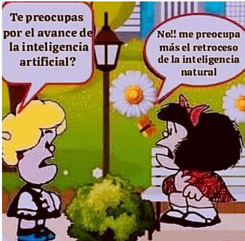 Entonces nos surgen preguntas, ¿nos quedamos esperando que surja esta nuevo filosofía que nos guíé en nuestro diario vivir o la vanos creando a medida que vivimos? Es decir, ¿esperamos pasivamente a que otros nos indiquen el camino o nos constituiimos en seres humanos dignos ycriadores de historias?, ¿nos importa más el desarrollo de la IA que la inteligencia natural como nos cuestiona Mafalda?