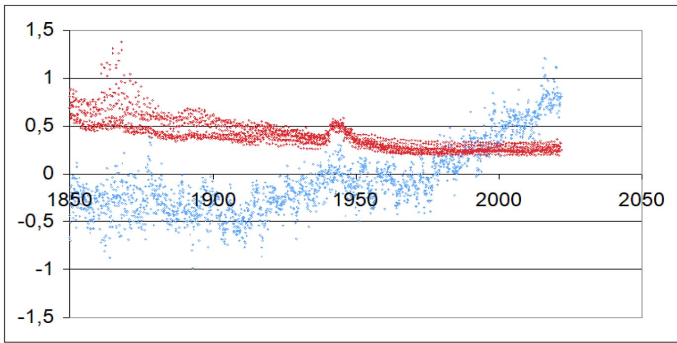 Fig. 1: GMST behavior (blue dots) between 1850 and 2021 according to HadCRUT (database downloaded and analyzed by the author). [14] The red dots are the upper and lower values of the standard deviation for a confidence level of