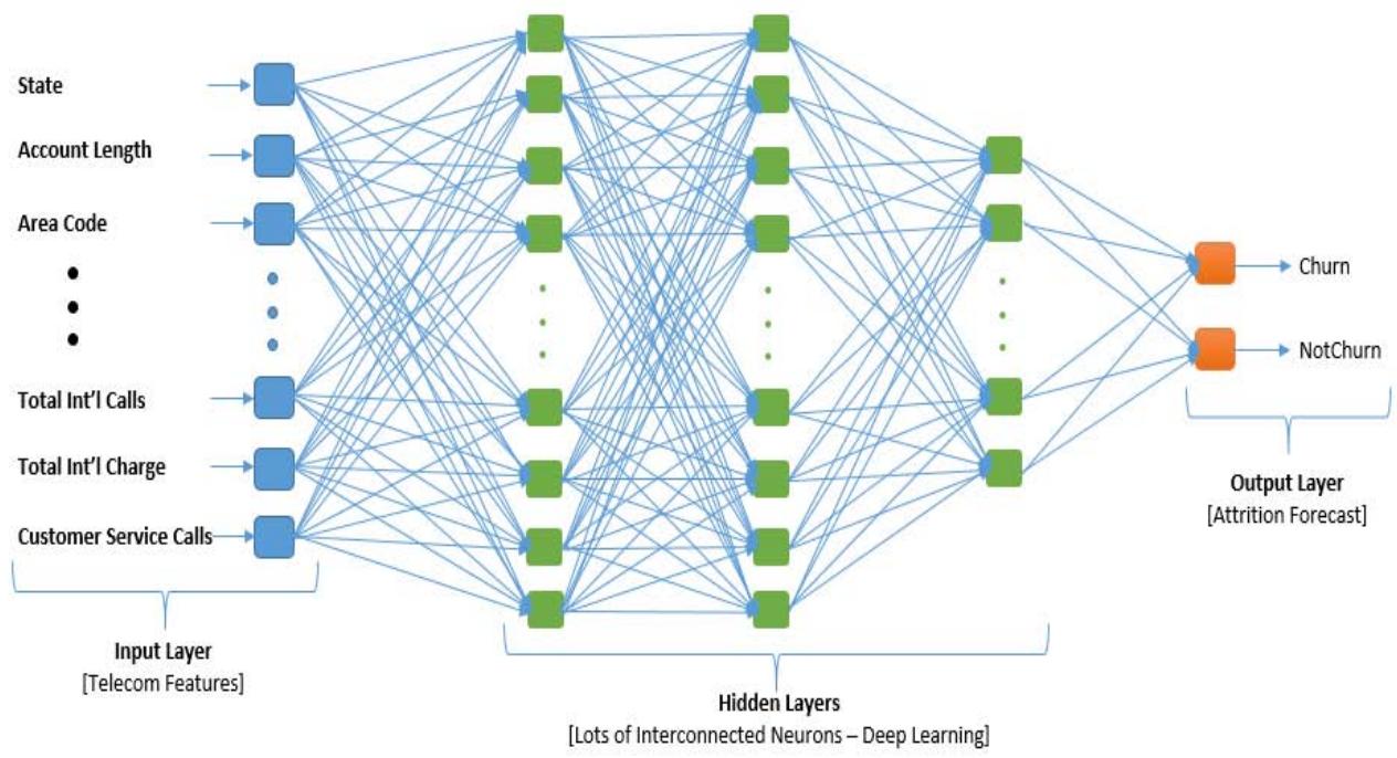 The proposed customer attrition model in a telecom company is a machine learning approach to solving churn problems. It involves the evaluation of the performance and effectiveness of DNN model in customer attrition. The implementation of a Deep Neural Network (DNN) for forecasting customer attrition involves a systematic approach to building a robust predictive model capable of accurately identifying customers at risk of churn. The process begins with the acquisition and preprocessing of telecom customer data, including handling missing values, and normalizing features. Feature engineering and selection are then performed to identify the most relevant attributes that influence customer attrition. The DNN model is constructed with multiple layers to capture complex patterns within the data. Hyperparameters, including learning rate, batch size, and the number of hidden layers, are fine-tuned through methods such as cross-validation to optimize the model's performance. The trained model is then evaluated using metrics like accuracy, precision, recall, and F1-Score, demonstrating its effectiveness compared to traditional machine learning methods. The successful deployment of this DNN model enables the telecom firm to proactively identify and retain at-risk customers, thereby improving customer satisfaction and reducing churn-related revenue losses.