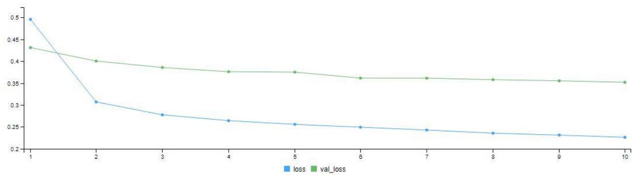 The model training was done twice with 10 and 100 epochs (i.e. iterations). Figure 3 is the model validation graph for 10 iterations. It shows the loss - validation loss and accuracy - validation accuracy of the model. We can see the loss line (blue line) coming far below the validation loss line (green line). At the final iteration, the loss line came down to a little above 0.2 mark. The accuracy of the model also climbed from $78\%$ to a little above $90\%$ as seen in the graph. In Figure 4.6, after the 100 iterations, we can see the loss line (blue line) coming far below the validation loss line (green line). At the final iteration, the loss line came down below 0.1 mark. The accuracy (blue line) of the model also climbed from $93\%$ to above $98\%$ as seen in the graph.