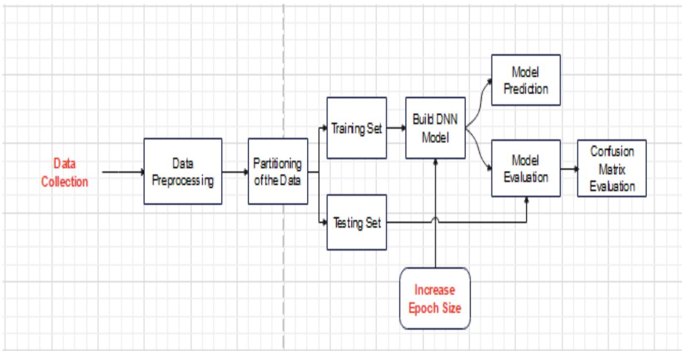 The dataset is loaded as input into the DNN architecture. The already downloaded file is stored in a folder in the system where the code file is stored and is easily loaded to the system for manipulation by the model.