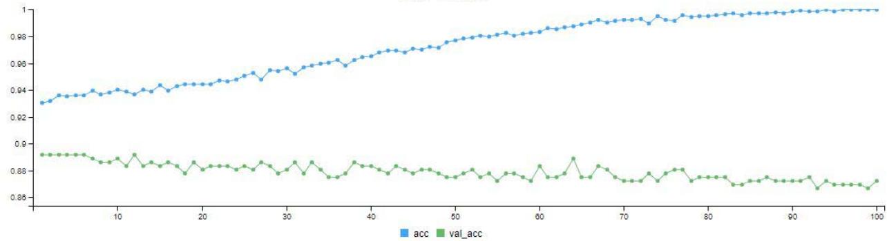 In Figure 4. after the 100 iterations, we can see the loss line (blue line) coming far below the validation loss line (green line). At the final iteration, the loss line came down below 0.1 mark. The accuracy (blue line) of the model also climbed from $93\%$ to above $98\%$ as seen in the graph.