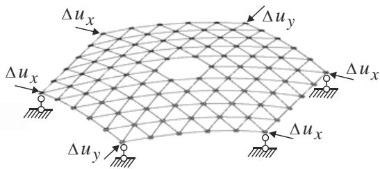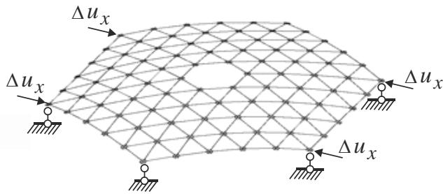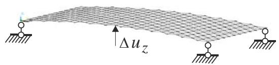 The initial configuration of this truss structure is shown in Fig. 18. In this case, we assume $\Delta u_{z} = 0,5\mathrm{m}$. The scheme of the 4-node kinematic loading is presented in Fig. 19. Here, $\Delta u_{x} = 0,05\mathrm{m}$.