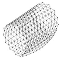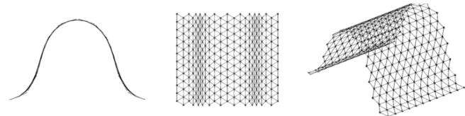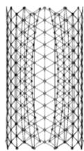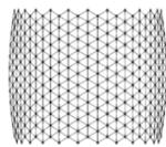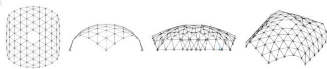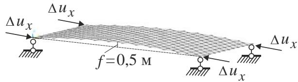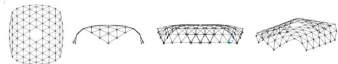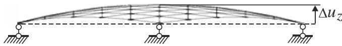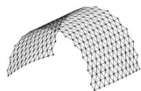 It is necessary to understand that the transformation process from the position where the coordinates of all nodes are equal to 0 will not lead to the expected rise of the rod lattice, i.e., it is necessary to "start" (begin the transformation) with a pre-prepared dome-like geometry (Fig. 9). Let's take the "starting" rise of the arrow $\Delta u_{z} = 0,1\mathrm{m}$.