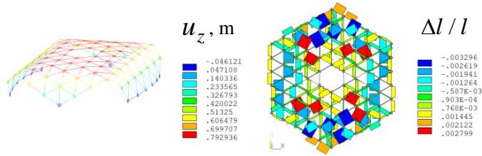From the graphs shown in Fig. 12, it is evident that the most heavily loaded members under the given transformation scheme will be the struts adjacent to the boundary nodes. In physical terms, the extreme value of $\Delta l / l = 3.5\%$ corresponds to a member elongation of $\Delta l = 0.4 \cdot 0.035 = 0.014 \mathrm{~m}$ (14 mm). Naturally, such an axial deformation exceeds the limits of linear theory, and for the corresponding truss members in the actual structure, it is necessary to provide compensators to accommodate this excessive elongation. For this purpose, telescopic compensators with unidirectional collet grips would be a suitable solution.