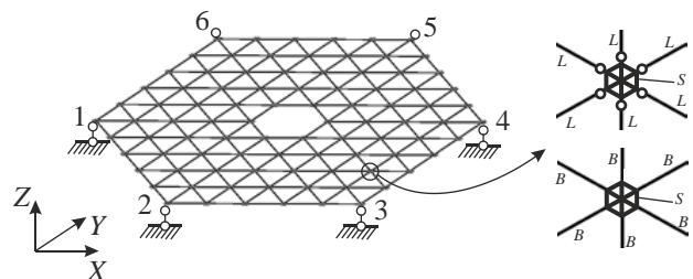 We will conduct a study of a regular truss system, shown in its initial (undeformed) state in Fig. 5, considering the controlled displacement of the boundary nodes 1, 2,..., 6. In the separate fragments of Fig. 5, the letters L and B denote the grids formed by the hinge-rod (truss) and beam finite elements, respectively. In both cases, the nodal platforms S are modeled as practically non-deformable beam finite elements. The distinctive feature of this computational scheme compared to the scheme in [13] is the presence of the nodal platform S, modeled by rods with a modulus of elasticity exceeding the modulus of elasticity of the connecting rods by five orders of magnitude. From a structural point of view, the introduction of the platforms S allows us to conditionally account for the nodal connections of real truss systems. An example of the modeled structure of a real nodal connection is shown in Fig. 6 [14]. This node is a demountable structure with one central and six peripheral bolted connections, providing relative mobility of the truss members.