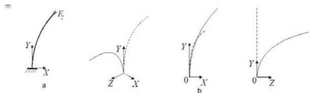 b - visualization of the beam deformation relative to the initial position (dashed line)